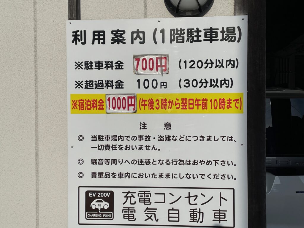 2階は管理人が待ち構えており、料金を現金で前払いすればOK。「1泊でお願いします。」とお伝えすれば大丈夫です。支払いを済ませると、車中泊カードをもらえるので、駐車中は見えるところに掲示して、帰りに返却という流れ。やや手間に感じるけど、静かに車中泊できるのは2階ですので、おすすめは2階。