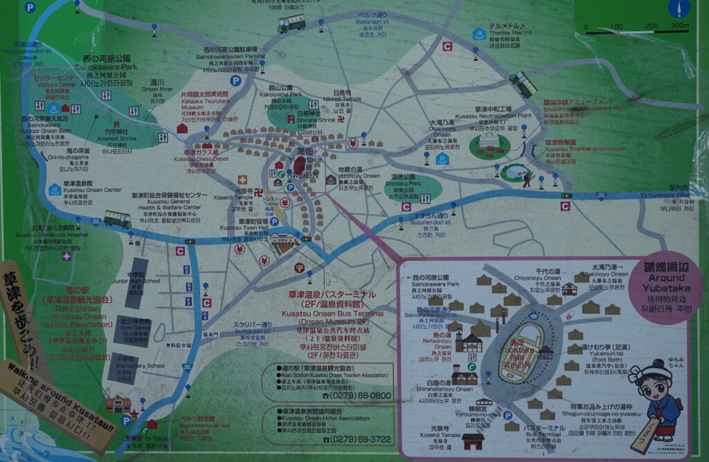 草津温泉市街地の地図はこんな感じ。中心に位置する湯畑が拡大されていますが、バスターミナルの目の前が、今回紹介する車中泊スポットの湯畑観光駐車場です。