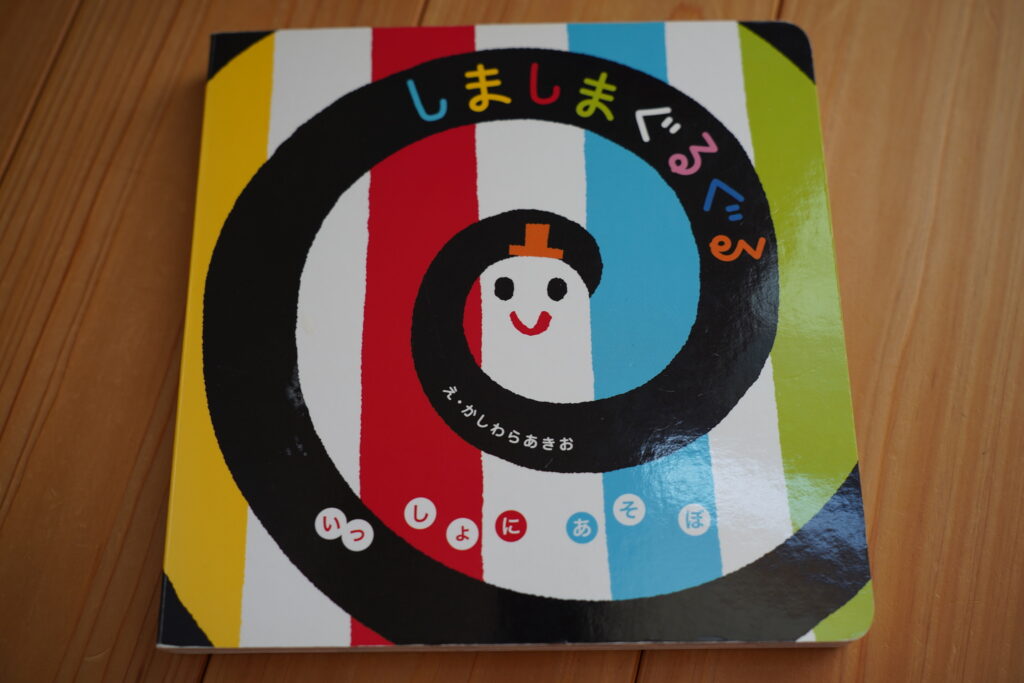 「しましまぐるぐる」はその名の通り、”しましま”と”ぐるぐる”を組み合わせた絵本。絵本の中にさまざまな表情をした「お顔」が隠されているのですが、絵本を読んでいる自然な流れで、ここだよ!と指で指し示すことができます。