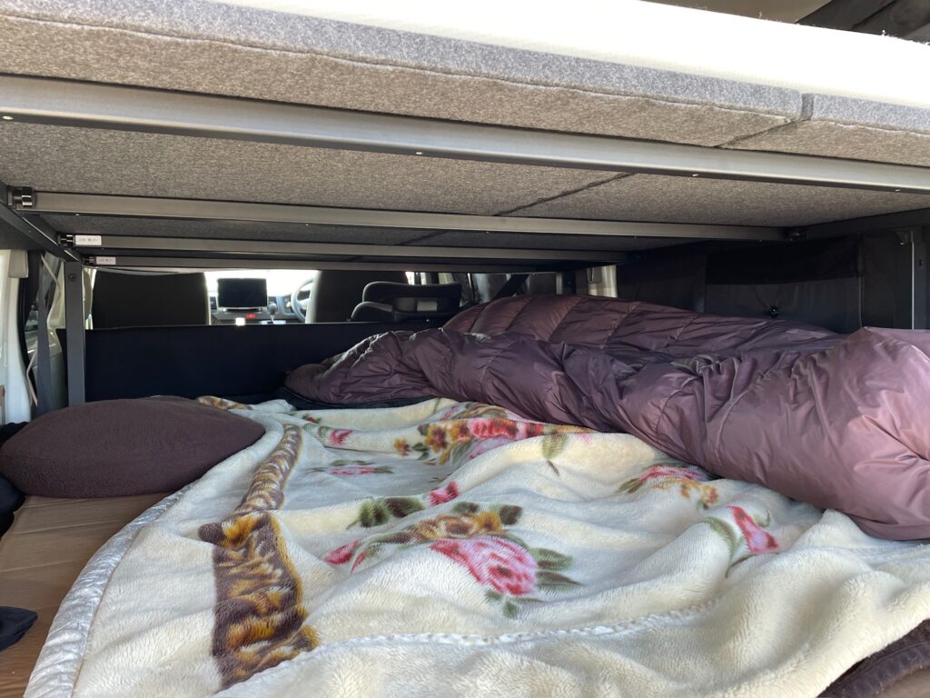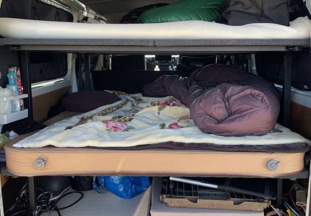 冬の車中泊の電気毛布の使い方としては、マットレスの上に電気毛布を敷いて、その上に毛布(家にあるものを敷いて低温やけどを防ぐ)を重ねるのがオススメ、その上に寝袋を掛けて寝ます。寝袋をマミー型にして包まれるようにすれば、良いのかもしれませんが、それでも触れていないところは冷えます。