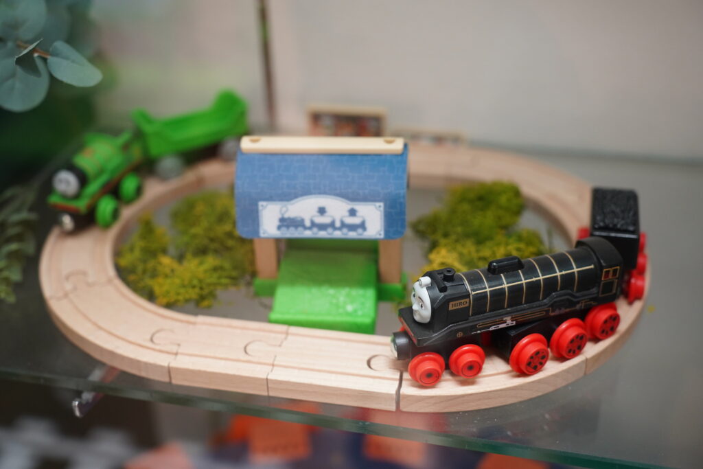 車庫は正直こども自身でレールを組み合わせて作ることもできるのですが、完成品に勝るものはありません・・・