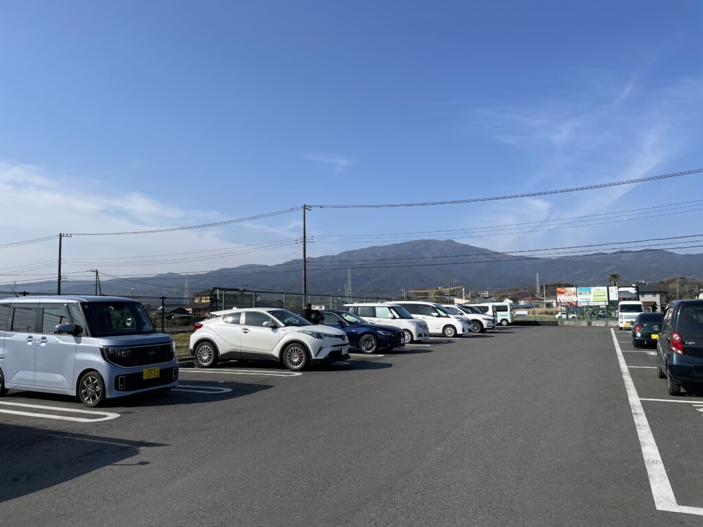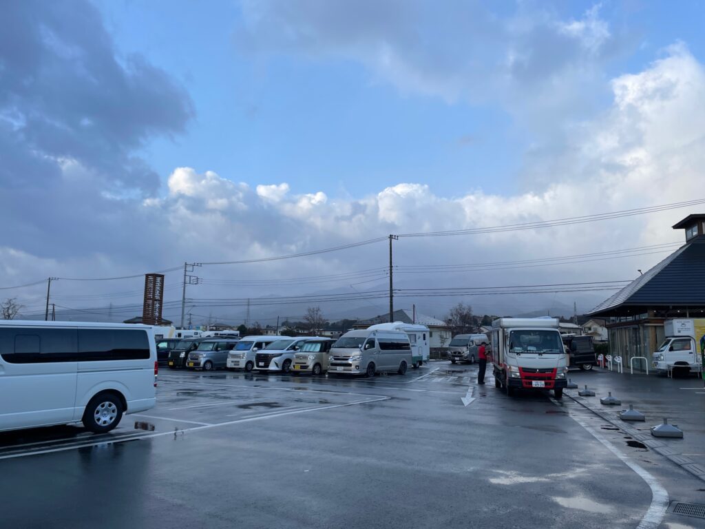 施設の近くのメイン駐車場です。道路側(写真の奥)がオススメの車中泊スポットです。施設が近く、トイレが利用しやすいです。また、どのエリアも共通しているのですが、地面が平らなので、車中泊に支障はないです。