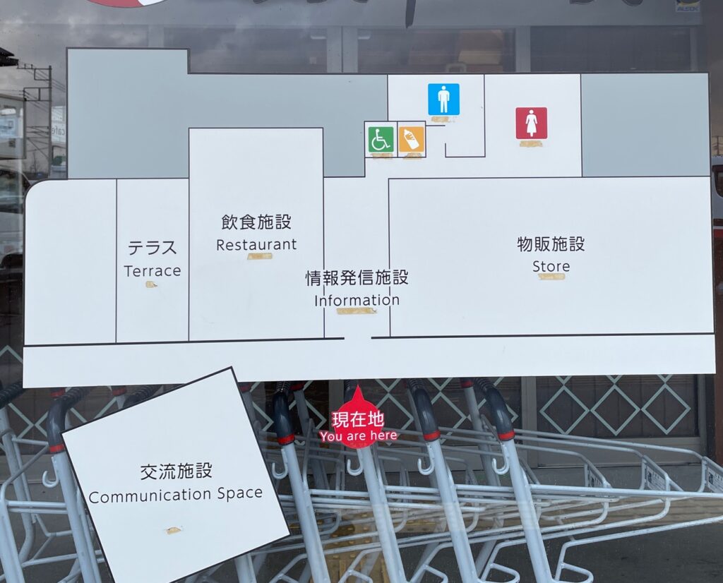 施設は1階建て。中央のエントランスの奥にトイレがあり、直売所とレストランがあります。