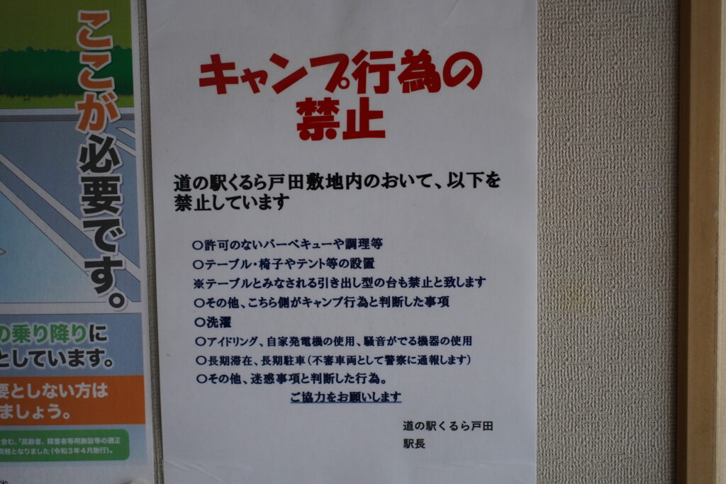 というのも車中泊などが決して勧められる訳ではない。という道の駅のスタンスがあるのだと思います。キャンプ行為の禁止という張り紙が至る所に貼られていて